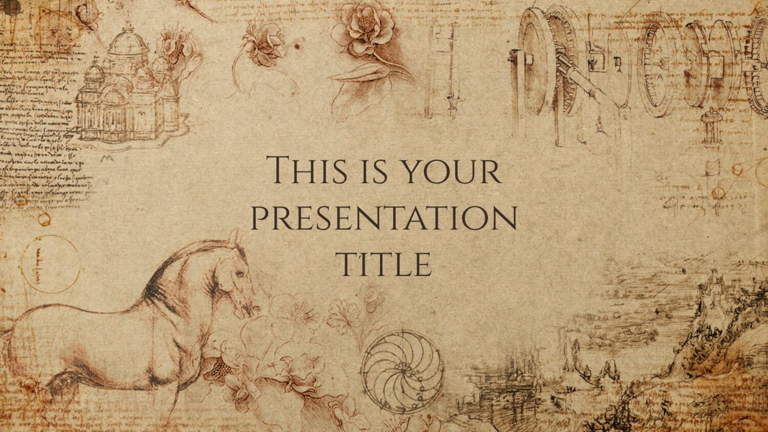 Dale a tu tema un aire histórico con fondo de papel texturizado, dibujos inspirados en Leonardo da Vinci y tipografía clásica. Esta plantilla de presentación gratis es ideal para docentes y estudiantes, pero también para ponentes y equipos creativos que quieren una estética elegante y atemporal.