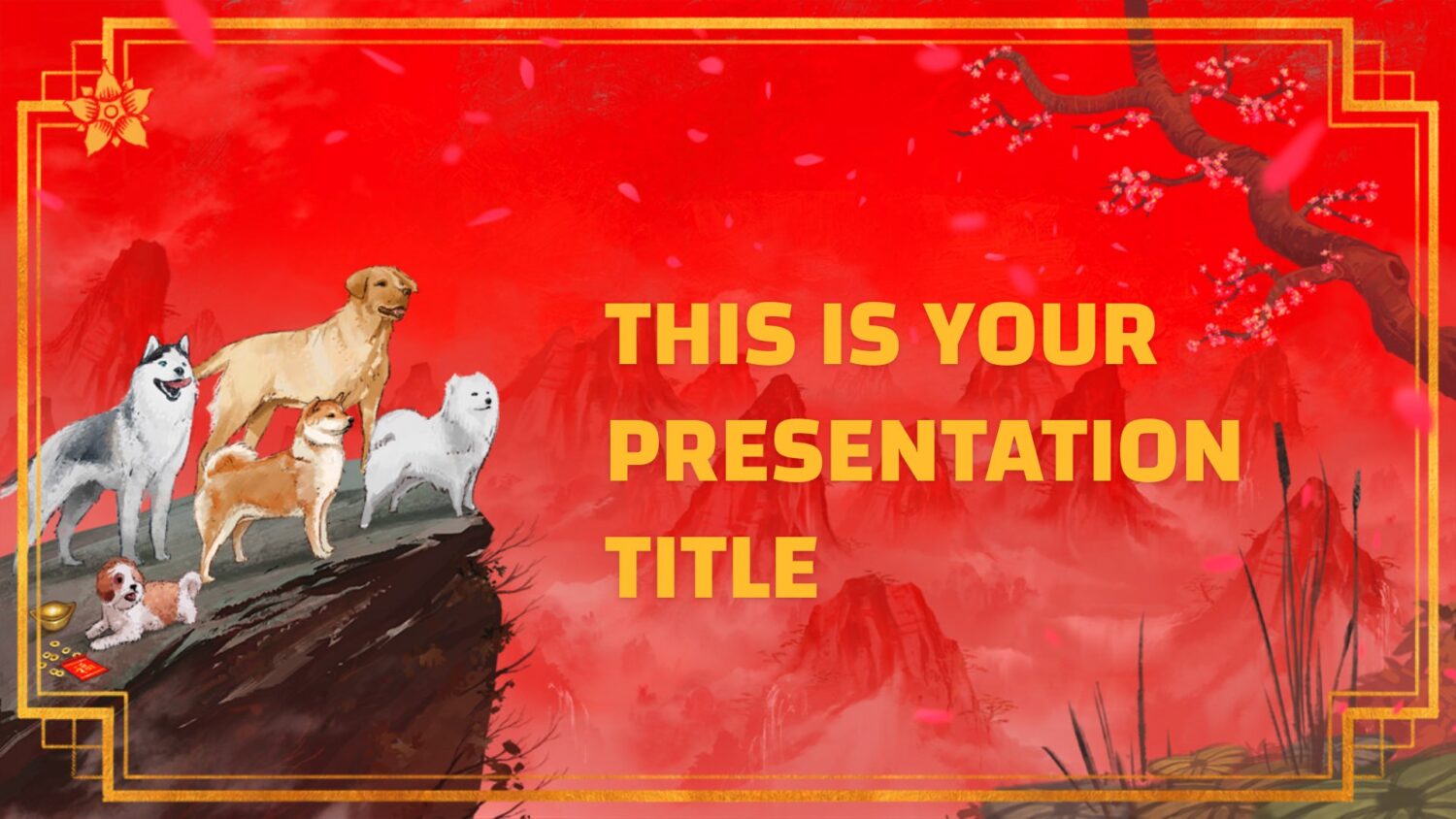 Si quieres celebrar el Año Nuevo Chino con un diseño lleno de significado, esta plantilla gratuita te ayuda a armar una presentación con estilo. La ilustración representa el Año del Perro, símbolo de lealtad y buena fortuna, e incluye la flor de ciruelo (meihua 梅花), asociada a la resiliencia. El rojo sugiere suerte y alegría, y el dorado se relaciona con prosperidad.