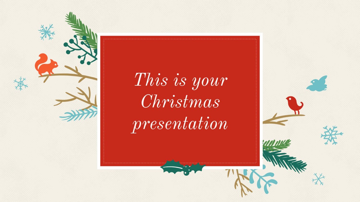 Úsala para enviar fotos navideñas, preparar saludos familiares, armar una presentación para la reunión de fin de año, presentar resultados antes de vacaciones o crear una invitación digital. Cambia textos, colores y tipografías, añade tus imágenes y ajusta las secciones según tu historia. Además, al estar en dominio público, puedes quitar la diapositiva de créditos. 100% personalizable y gratis.