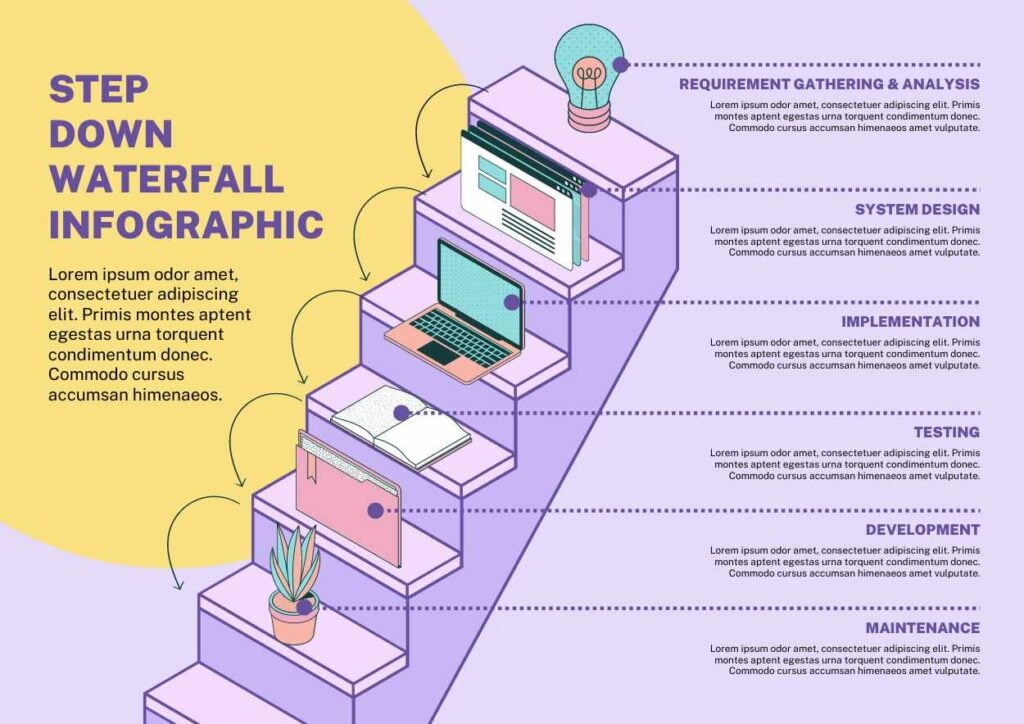PowerPoint Google Slides 1 A4 Projetos em Cascata Simples: burndown em Infográfico Download BásicoCorporativoFloral