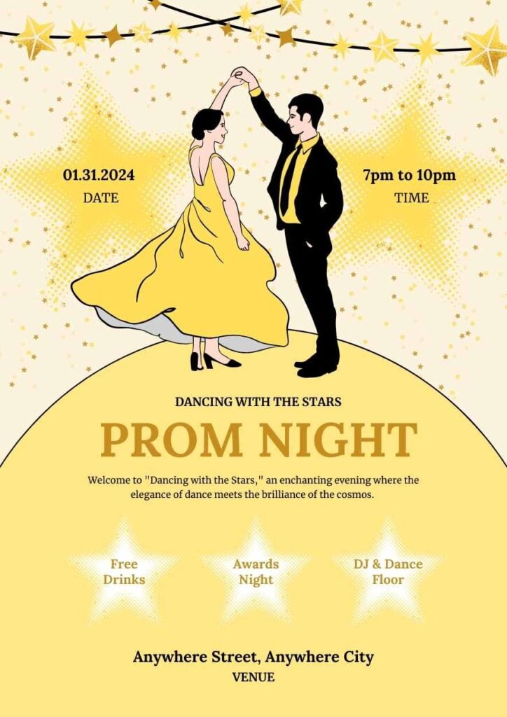 PowerPoint Google Slides 1 A4 Pôsteres Fofos de Noite do Baile em Slides Download AmareloFofoCelebração