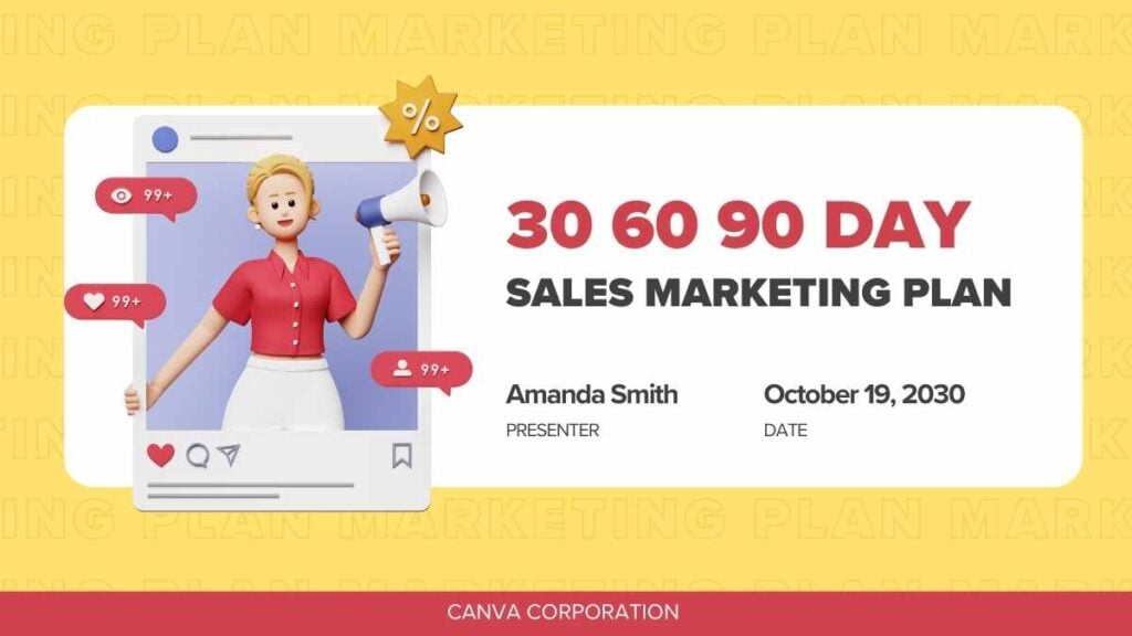 PowerPoint Google Slides 1 16:9 Plano de Vendas e Marketing 30 60 90 Dias Moderno em Slides Download 3DAmareloCorporativo